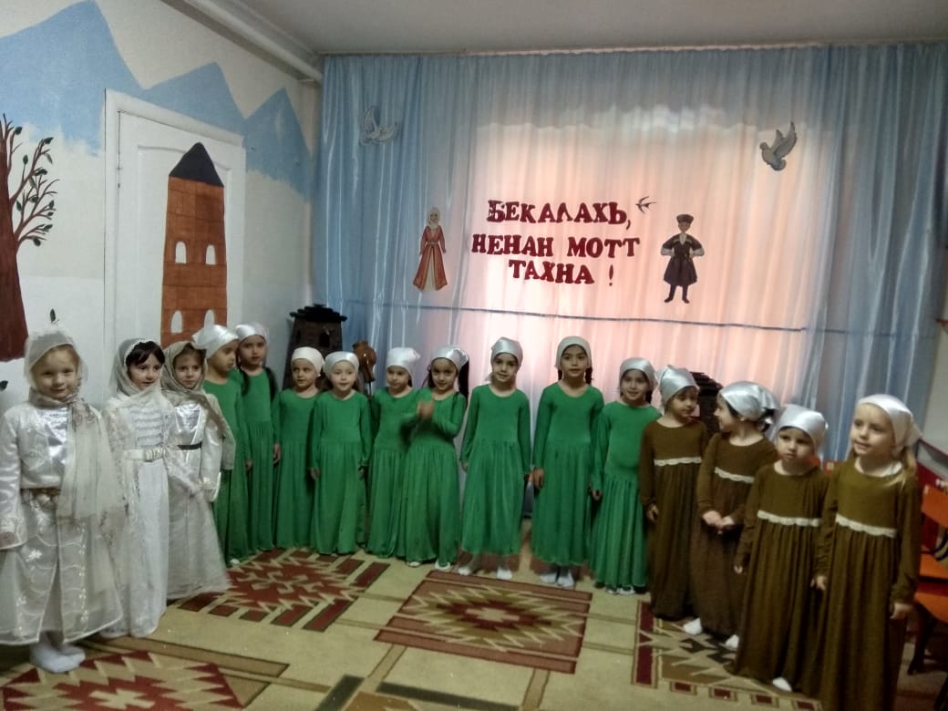 Дети всех возрастных групп читали стихи на чеченском языке, пели песню Али Димаева «нохчийчоь» .Девочки подготовительной группы показали национальный «Девичий» танец . Активное участие приняли дети из старших группы они так же пели песни и показывали сценки на чеченском языке. Такие мероприятия способствуют: развитию чеченского языка, национальной культуры, любви к родному языку и традициям, духовно-нравственному воспитанию. Нохчийнмотт, хьо бека бисалахьтахконзадисинчуаганна, ненанмотт,хьохезчохьбисалахь Нана мел езачу беранна Нохчийн мотт хьо.